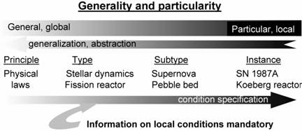 Humans can think in a whole spectrum of generality, from abstract logic to concrete sensual experiences. Academic disciplines such as history emphasize the details of particular incidences. Some generalizations are inevitable because historical narratives must use concepts, but the generalizations are so embedded and small in scope that historiography is poor in causal explanations and impotent in predictions. Attempts at grand generalization about the laws of history have yielded nothing fruitful. The ability of natural science and engineering to explain or predict specific phenomena rests heavily on their ability to connect the general and the particular. The connections usually involve many steps with various degrees of scope and detail. At the most general level are universal physical laws for fundamental mechanisms and interactions, for instance that of quantum mechanics and nuclear interactions. Narrowing the scope by specifying more details, we come to broad types of phenomenon: physicists study stars, which are nuclear fusion reactors in the sky, while engineers design nuclear fission reactors on earth. Narrowing further, smaller subtypes come into focus: a type of star called supernova or a type of meltdown-proof reactor called pebble-beds. Further details pinpoint a locality: the supernova SN 1987A or the pebble bed reactor being built in Koeberg, South Africa. Science and engineering do not jump from the general to the particular or vice versa. They zoom rigorously through many steps, each involves more abstraction or addition of details, each demands much effort.